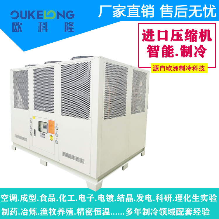 歐科隆牌風冷式冷水機之制冷心臟采用全密封低噪音,振動小,高效能省電進口名牌壓縮機,電器控制全部采用進口名牌原件,熱交換器采用殼管式冷凝器,換熱效能高,便于清洗保養。4.采用高效率之螺紋鋼管,兩端蓋可互換以交更接水管方向,水管流程多回路,各臺冷凝器都與壓縮機容量互相配合,直通式水管易清洗和維護保養。