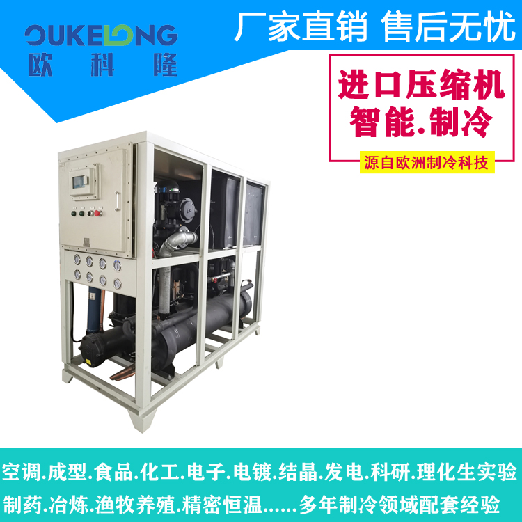 歐科隆水冷箱式防爆冷水機(jī)組專為石油化工、制藥、鋰電池生產(chǎn)等易燃易爆環(huán)境設(shè)計(jì),通過國家Ex dⅡBT4防爆認(rèn)證,整機(jī)采用防爆結(jié)構(gòu)及無火花元件,確保在危險(xiǎn)場所安全穩(wěn)定運(yùn)行,為關(guān)鍵工藝提供可靠制冷保障。